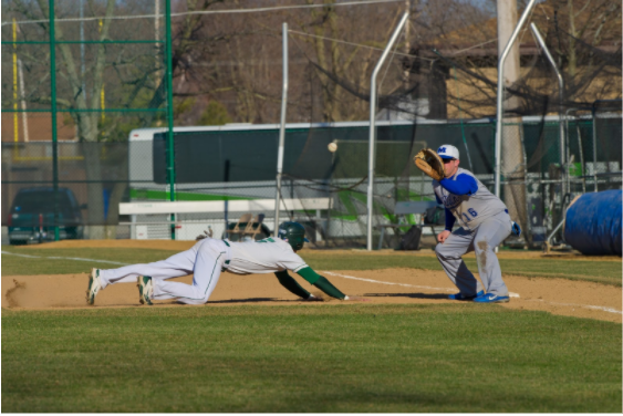 IWU player diving back into the base against Millikin Photo: Illinois Wesleyan