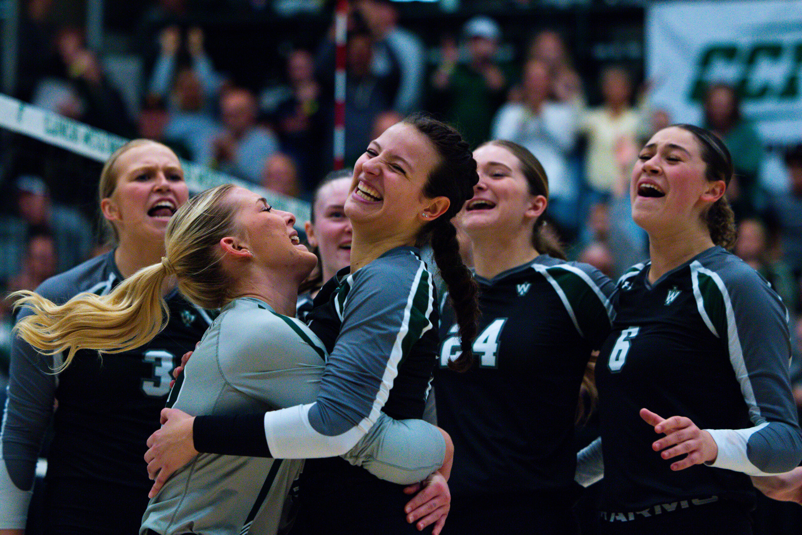 Hannah Tellor in action against Carthage College. French in the team's huddle after the victory that sent the…