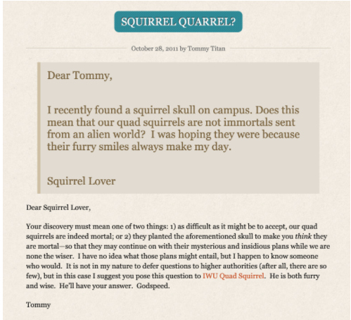 As my search continued, a friend sent me a link to an old IWU blog, Ask Tommy. This blog ran from June 2009 to August 2012 and had one squirrel related question that caught my attention. “Dear Tommy,” the query said, “I recently found a squirrel skull on campus. Does this mean that our quad squirrels are not immortals sent from an alien world? I was hoping they were because their furry smiles always make my day.”