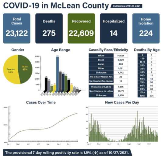 Although the rolling positivity rate has gone down, McLean County is currently experiencing high community transmission based on the 7-day moving average of new cases. After the Halloween weekend, the county will offer vaccination clinics to encourage McLean County residents to get vaccinated. Approximately 195,477 doses of COVID-19 vaccine have been administered in McLean County as of October 28.