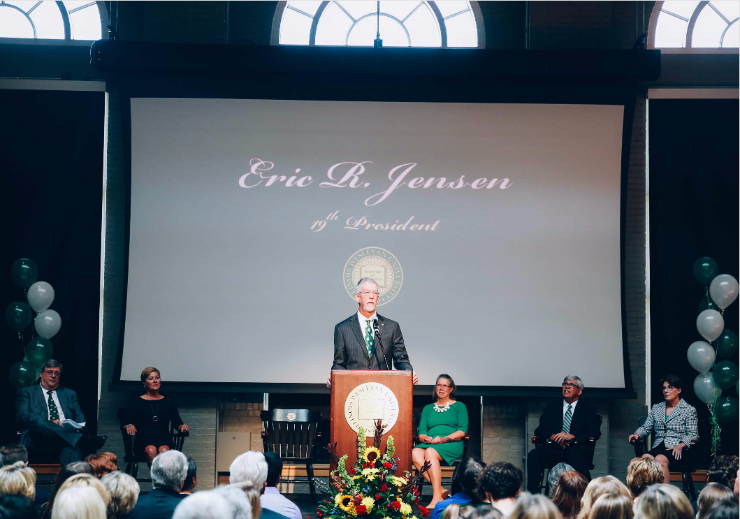 Jensen then sincerely thanked former President Wilson and his wife for the gracious welcome and that he planned to hold President Wilson to his promise of helping his successor during the transition. Jensen said he hopes to meet every student, faculty and staff member, alumni, and the community during his term and to help create “an increasingly unique Illinois Wesleyan University.”