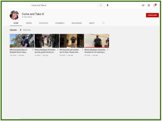 In another video titled “Illinois Wesleyan University. Arrested for wearing a mask” the student was shown being removed from State Farm Hall after refusing to wear a mask. BPD Officer R. Fryman informed the student that, “if [the university] asks you to leave, because they have the right to do that, [and] you don’t, you are trespassing, which is an arrestable offense.”