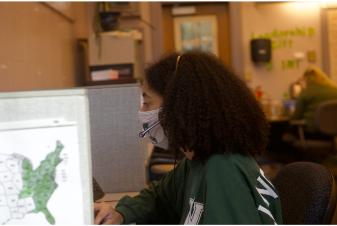Senior Dareana Roy works on the computer at her on campus job in the call center.